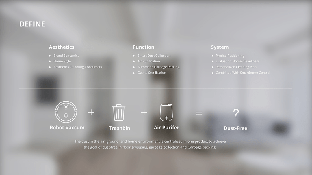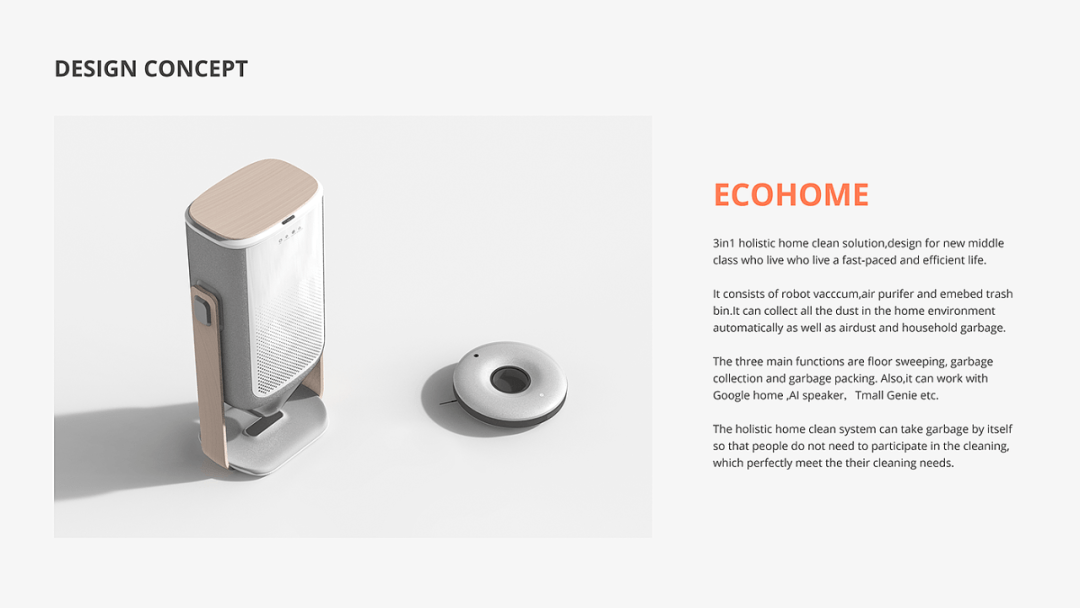 ECOHOME由機(jī)器人吸塵器、空氣凈化器和emembed垃圾桶組成。它可以自動(dòng)收集家庭環(huán)境中的所有灰塵以及空氣灰塵和生活垃圾。